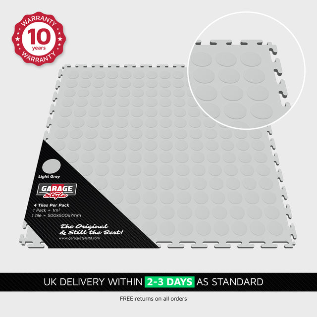 Please note that we don’t recommend using light grey or any of the other light colours in high traffic areas due to potential tyre markings and need for regular cleaning. Instead we recommend our black and graphite garage floor tiles for these areas.
