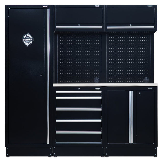 Part of the BUNKER® modular storage system. This stunningly designed combo is easily installed inside a garage or workshop to create your ideal storage system. All units are made from premium-quality steel and have a durable matt black textured industrial powder-coated finish. The floor cabinets are covered by a stylish stainless steel worktop and provide incredibly versatile storage, featuring large cupboards with fully adjustable shelves and smooth soft-close drawers lined with lush foam to protect your tools. The fixed base cabinets have adjustable feet for optimal positioning on an uneven floor. All wall cabinets have lift-up doors for convenient access, operated by whisper-quiet gas struts. For added storage, the back panels act as pegboards, and each includes one pre-cut hole for access to a power supply. Each unit has an integral lock for security and two keys are supplied. The combo comes with all the required fittings for simple installation. For your quality assurance, all BUNKER® units include a 10-year warranty. Every combo includes a free magnet of the distinctive BUNKER® logo.